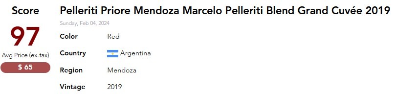 Med astronomiske 97 points fra James Suckling opnår ”Grand Cuvee” samme bedømmelse i årgang 2019 som ”Cheval des Andes” – en af de mest eftertragtede og ekstremt dyre vine fra Argentina. Denne imponerende bedrift understreges af Tim Atkin, der udråber Marcelo Pelleritis flagskib som et af de bedste Bordeaux blends i verden.